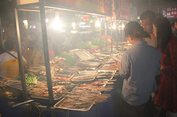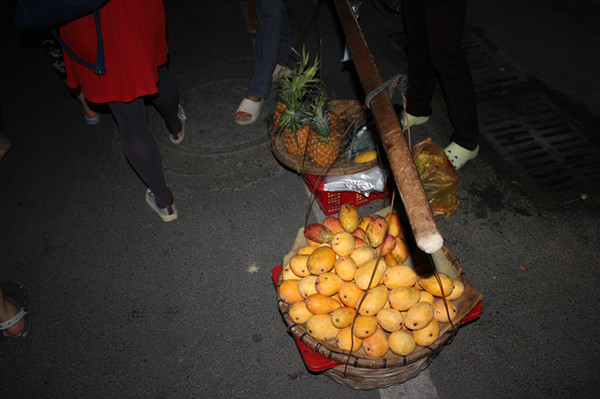 下午3点半的飞机,晚上6点左右我们就到了三亚,在酒店安顿下来之后,我们便分成几组各自寻找美食去了。酒店旁边的道路两旁摆满了各种鲜艳的裙子、泳衣、防晒帽、丝巾等,当地的居民挑着满箩筐的水果在街边卖,有菠萝、芒果、蓝莓等(后来才知道这所谓的蓝莓其实是提子,囧。。)。当地特色的水果炒冰及海鲜大排档勾起了我们的食欲,我们一行十余人喝着啤酒、吃着烧烤、吹着海风,享受着这闲暇时光。