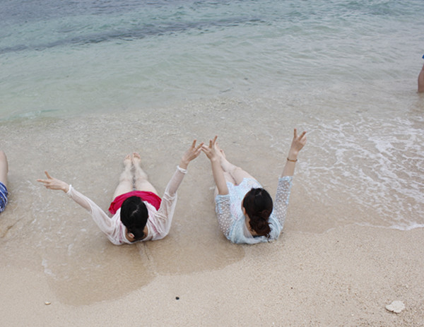 第二天才是旅行的真正开始。第一站我们来到了有“美女岛”之称的分界洲岛。这里依山傍海,椰林婆娑,沙滩松软细白,海水清澈,海水能见度达5—10米,适宜开展各种丰富多彩的海上娱乐项目、大海之美、尽在其中。这里的海,是真正的蓝色。远处是墨蓝,近处是浅蓝,深深浅浅的蓝色无比诱人。赤脚踩在沙滩上,细沙从脚趾缝里偷偷的溜走,痒痒的,正如你投奔大海的渴望。我们尽情在这里上玩耍、游泳、拍照,望着远处的海天一色,整个身心都变得很轻松。大爱这片蓝色的大海!